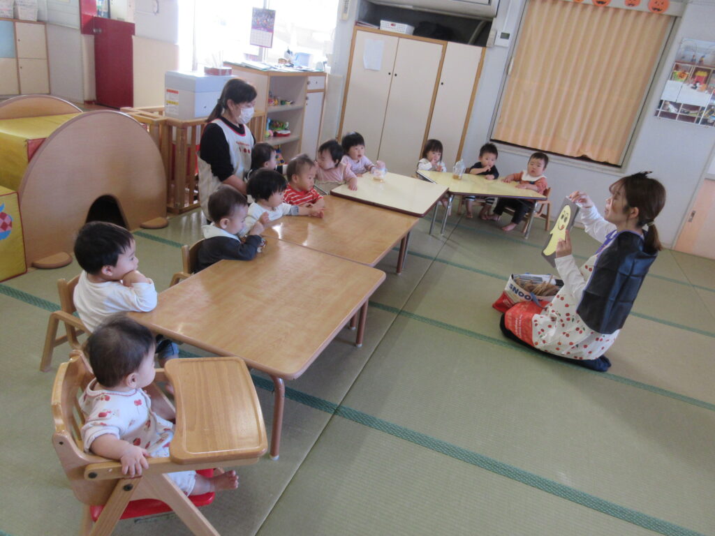 1歳児さんは、「トリックオアトリート!」と練習通りに言えたり、お菓子に夢中で手が先に伸びたり、もらったお菓子をお友だちと見せあったりしていました😊