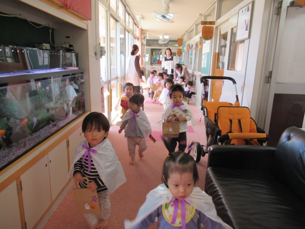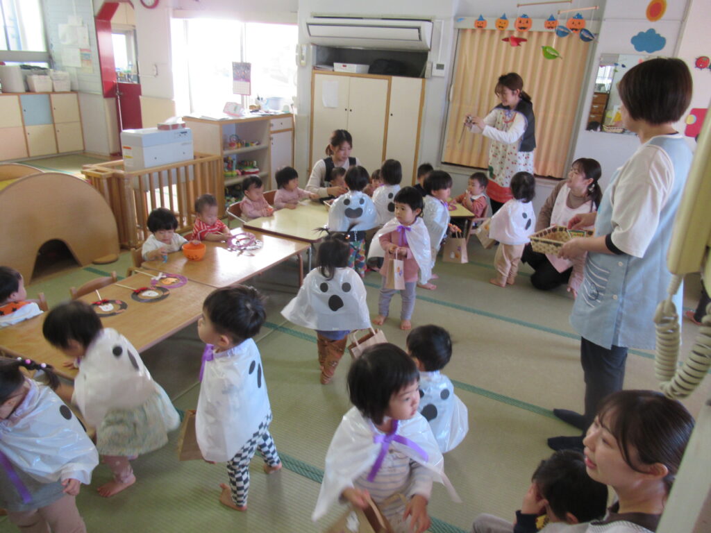 1歳児クラスの子どもたちは、手作りマントで仮装🌟