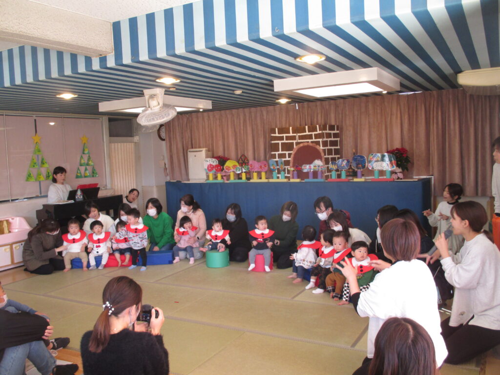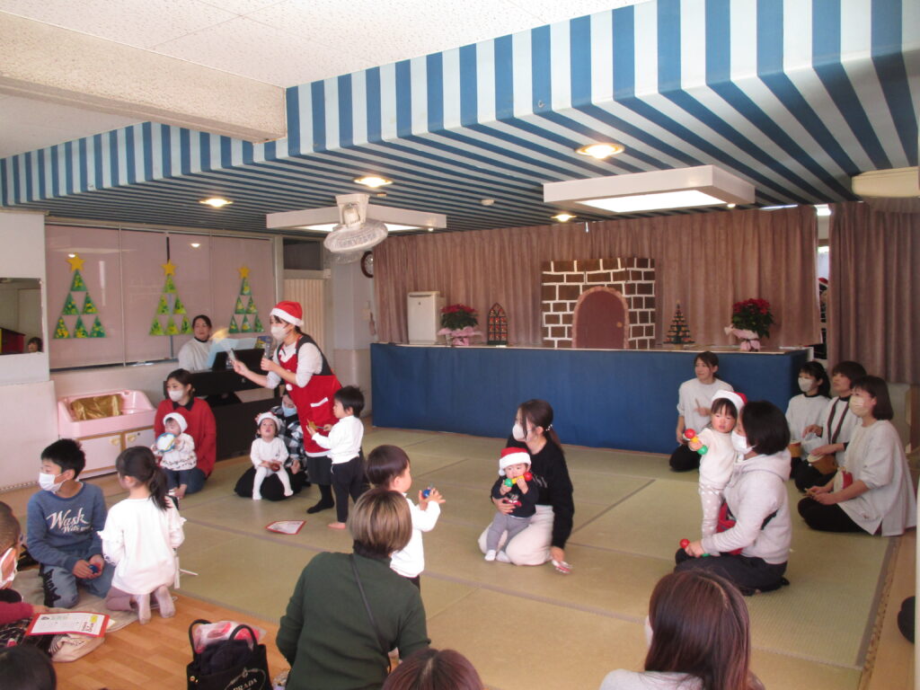 保護者の出し物では、「あわてんぼうのサンタクロース♪」の歌に合わせて、みんなで楽器演奏をしました!鈴、カスタネット、マラカス、たいこなど色々な楽器の音色が聴こえました🎶