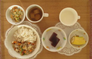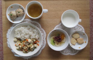 3時のおやつ:フルーツあんみつ&クッキー、牛乳