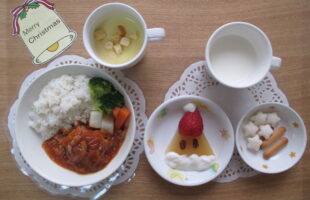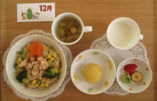 誕生会ランチ(クリスマスリース:カレーピラフ、鶏のから揚げ、人参甘煮&ブロッコリー、スープ)
