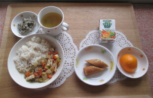 3時のおやつ:きな粉おにぎり、オレンジ、牛乳