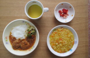 麦ご飯、煮込みハンバーグ、粉ふき芋、人参甘煮、ブロッコリー、コーンスープ・