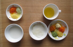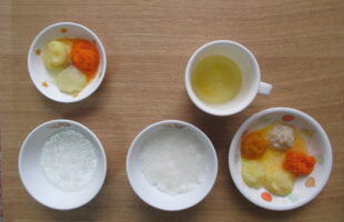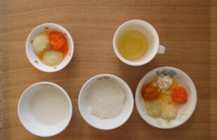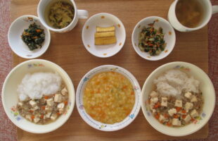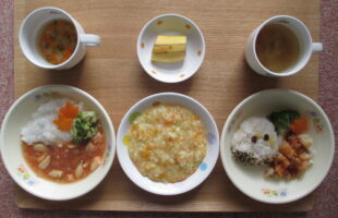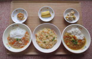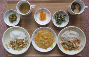 誕生会ランチ(くり:栗ご飯、魚のケチャップからめ、人参甘煮&ブロッコリー、スープ)・