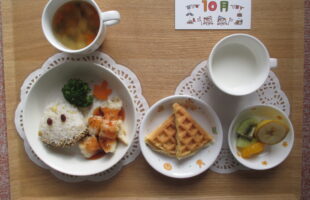 3時のおやつ:ワッフル、フルーツ盛り合わせ、牛乳