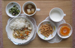 3時のおやつ:マカロニあべかわ、みかん、牛乳