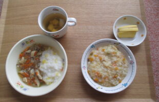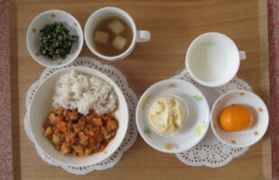 麦ご飯、ポークビーンズ、青菜ときのこの和え物、味噌汁3時のおやつ:チーズ入り蒸しパン、みかん、牛乳