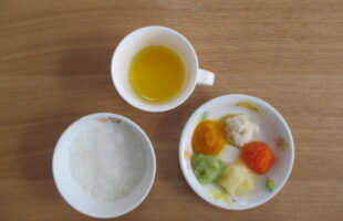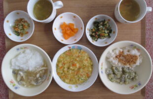 きな粉かけご飯、魚の磯辺揚げ、白菜の甘酢、南瓜の味噌汁