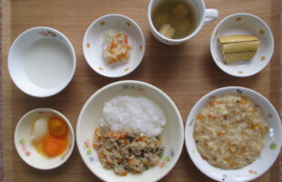 麦ご飯、煮込みハンバーグ、人参甘煮&ブロッコリー、スープ