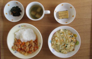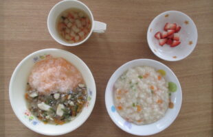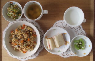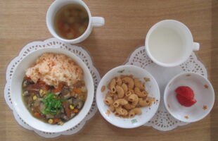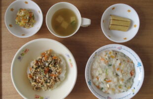 人参ご飯、揚げ魚の野菜あんかけ、スープ
