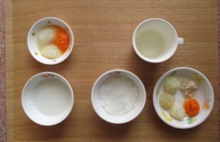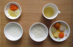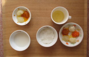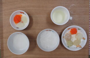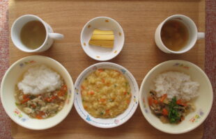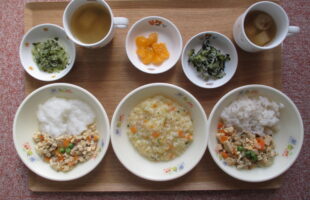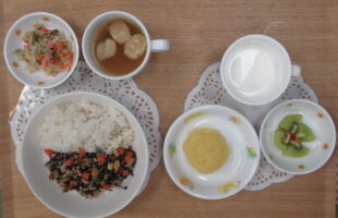 麦ご飯、大豆入りひじきの炒り煮、白菜の甘酢、味噌汁3時のおやつ:さつまいもきんとん、キウイ、牛乳