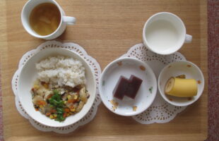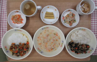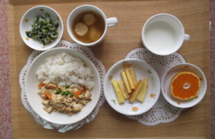 麦ご飯、高野豆腐の卵とじ、きゅうりとちりめんの酢の物、味噌汁・3時のおやつ:さつまいもスティック、みかん、牛乳