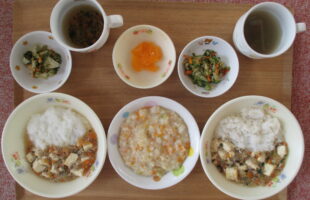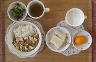 麦ご飯、マーボー豆腐、ブロッコリーの胡麻和え・わかめスープ3時のおやつ:ジャムサンド、みかん、牛乳