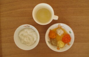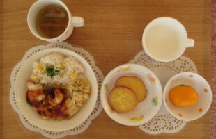 コーンご飯、魚のケチャップからめ、キャベツソテー、かぶ入りスープ3時のおやつ:ふかし芋、みかん、牛乳