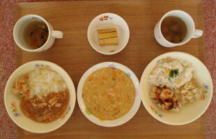 麦ご飯、干し大根の卵とじ、きゅうりとちりめんの酢の物、味噌汁3時のおやつ:きな粉入り蒸しパン、バナナ、牛乳