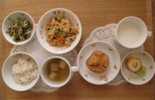 わかめご飯、魚の揚げ出し、人参甘煮&ブロッコリー、具だくさん味噌汁