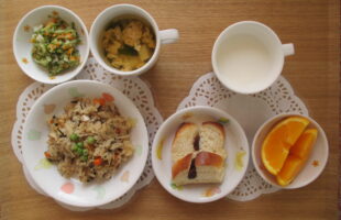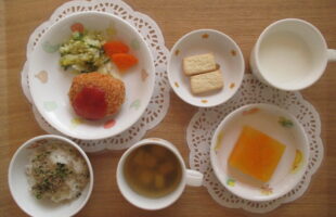 麦ご飯、ポテトコロッケ、野菜ソテー、人参甘煮、スープ、ちりめんふりかけ・