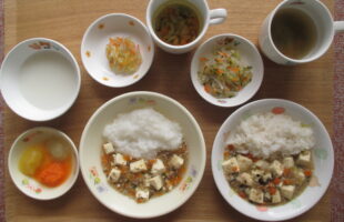 麦ご飯、マーボー豆腐、バンサンスー、わかめスープ