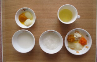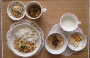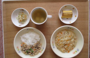 きな粉かけご飯、魚の竜田揚げ、なすの酢味噌和え、スープ