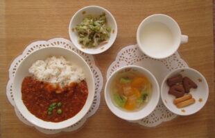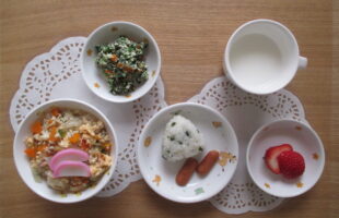 誕生会ランチ(花:チキンライス、つくね、きゅうり&人参甘煮、ポテト、五目スープ)