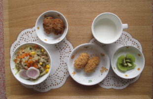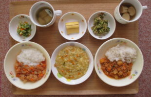 麦ご飯、高野豆腐の卵とじ、きゅうりとちりめんの酢の物、味噌汁・3時のおやつ:さつまいもスティック、みかん、牛乳