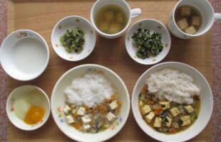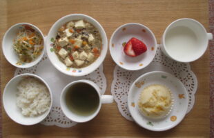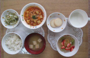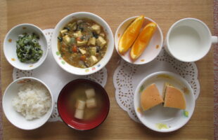 麦ご飯、マーボー豆腐、バンサンスー、わかめスープ
