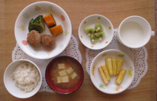 3時のおやつ:さつま芋スティック、キウイ、牛乳