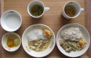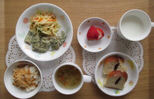 きな粉かけご飯、魚の磯辺揚げ、スパゲティソテー、スープ