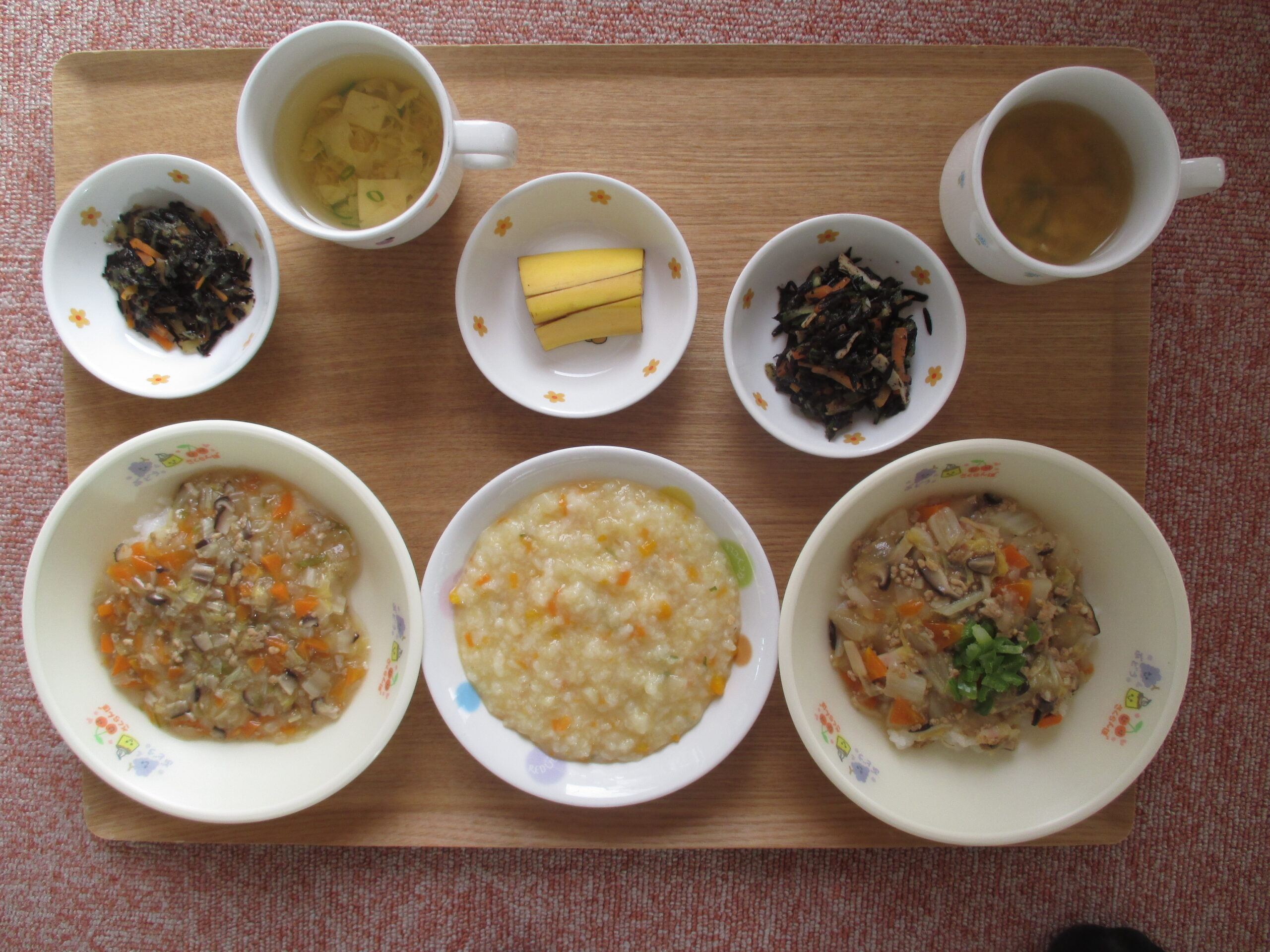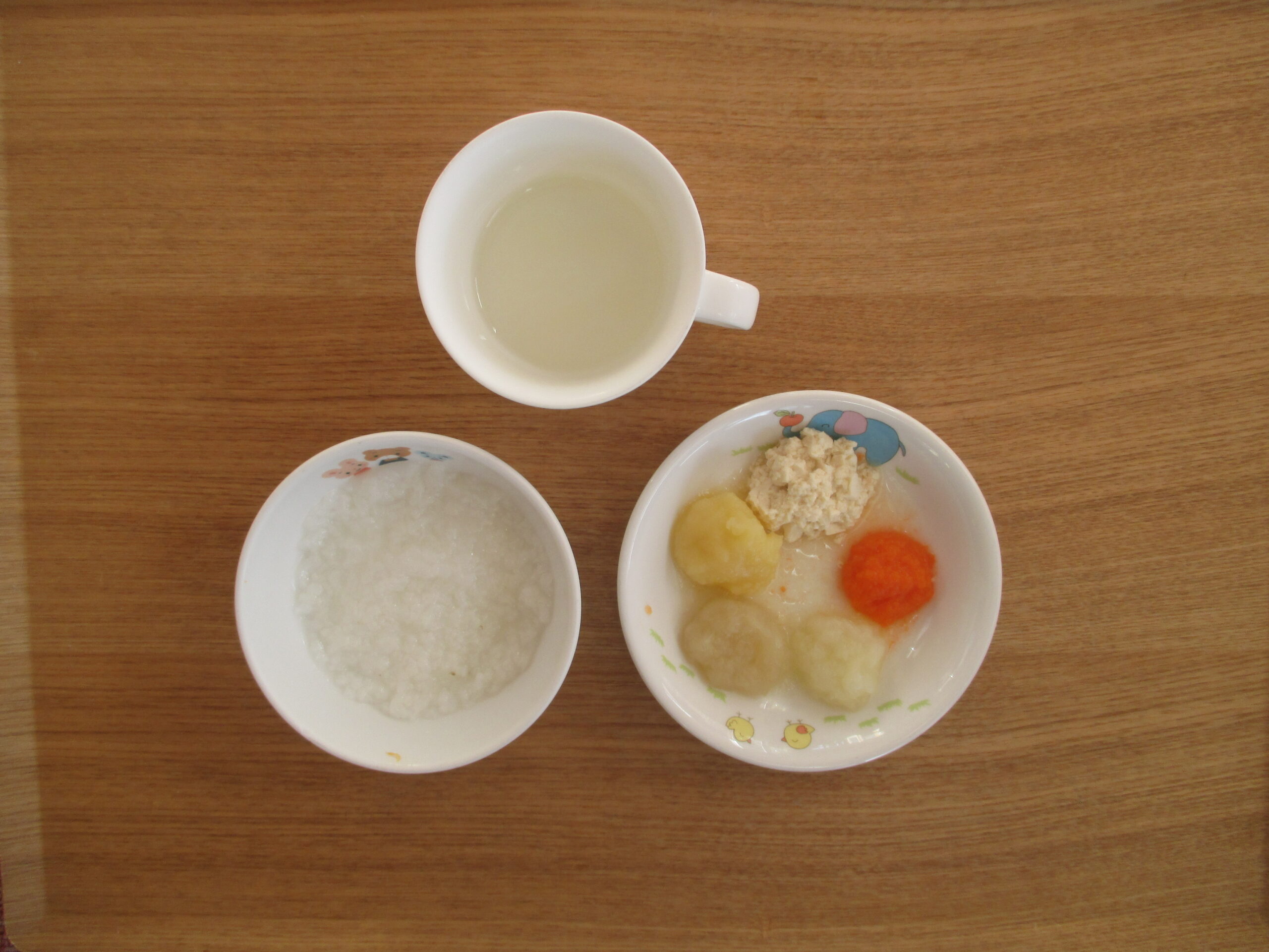 麦ご飯、干し大根の卵とじ、キャベツの甘酢、味噌汁・3時のおやつ:ポテトたこ焼き、みかん、牛乳