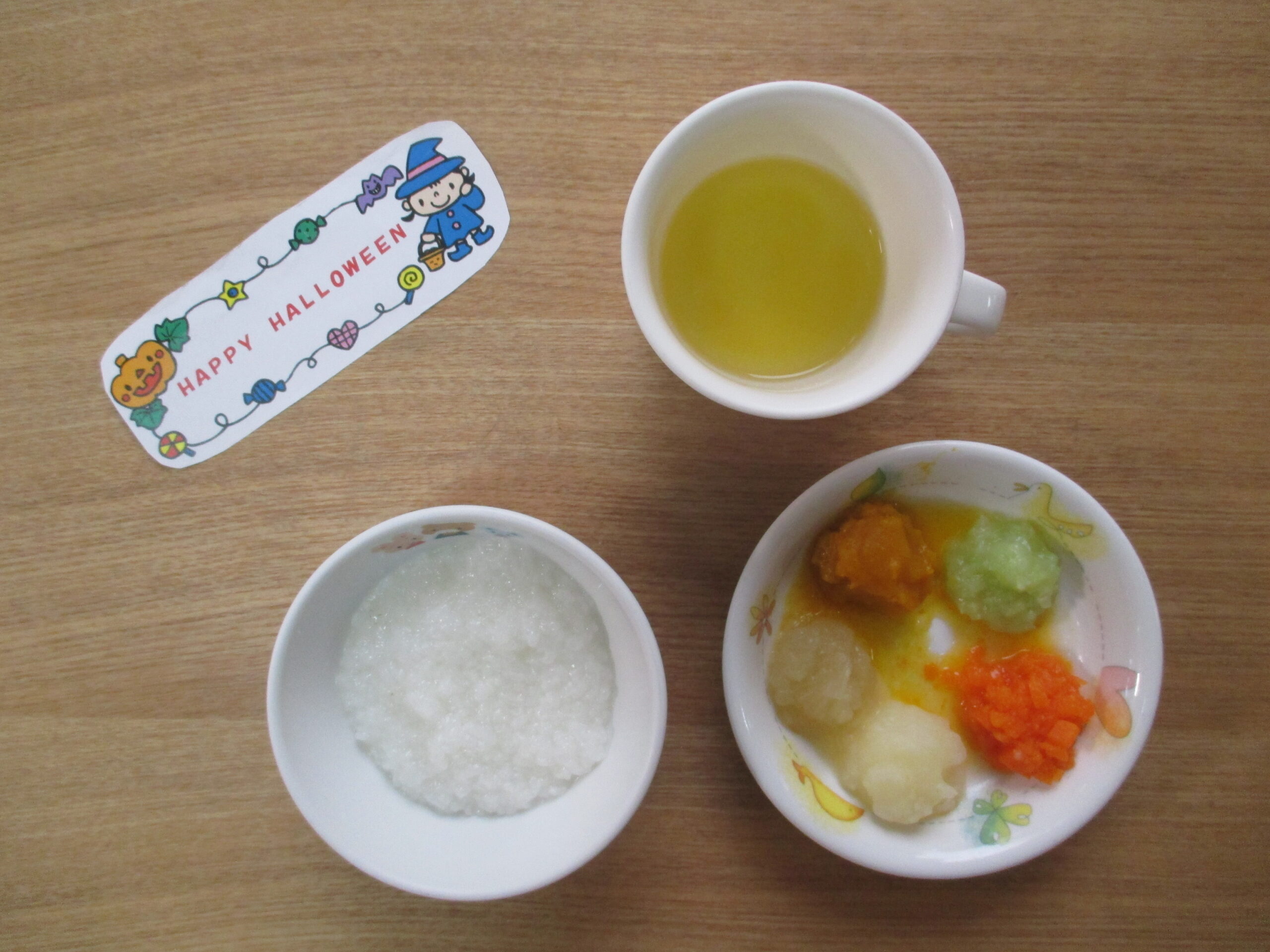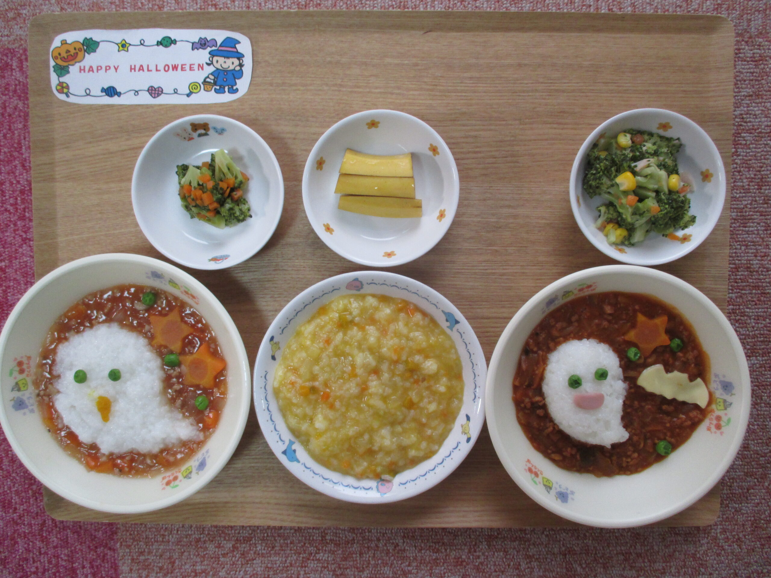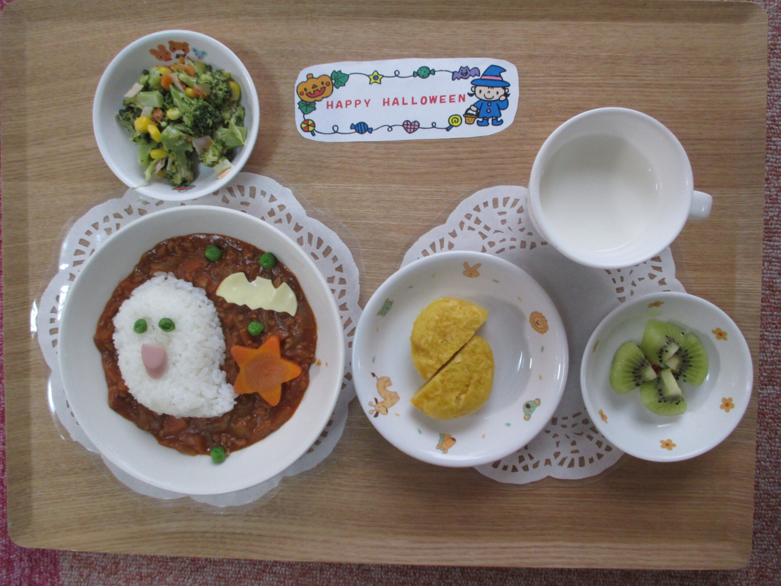 ハロウィンランチ(ハヤシライス、ブロッコリーサラダ)・3時のおやつ:パンプキン蒸しパン、キウイ、牛乳