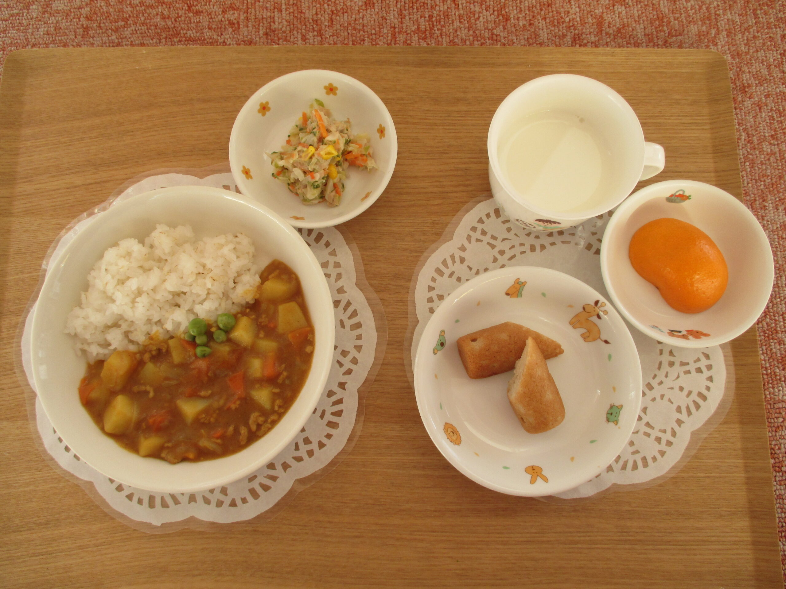 カレーライス、ツナサラダ・3時のおやつ:バナナケーキ、みかん、牛乳