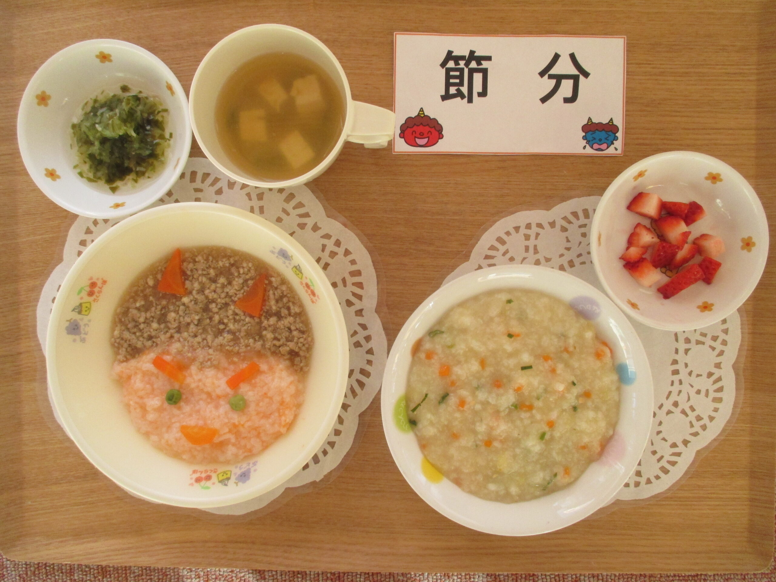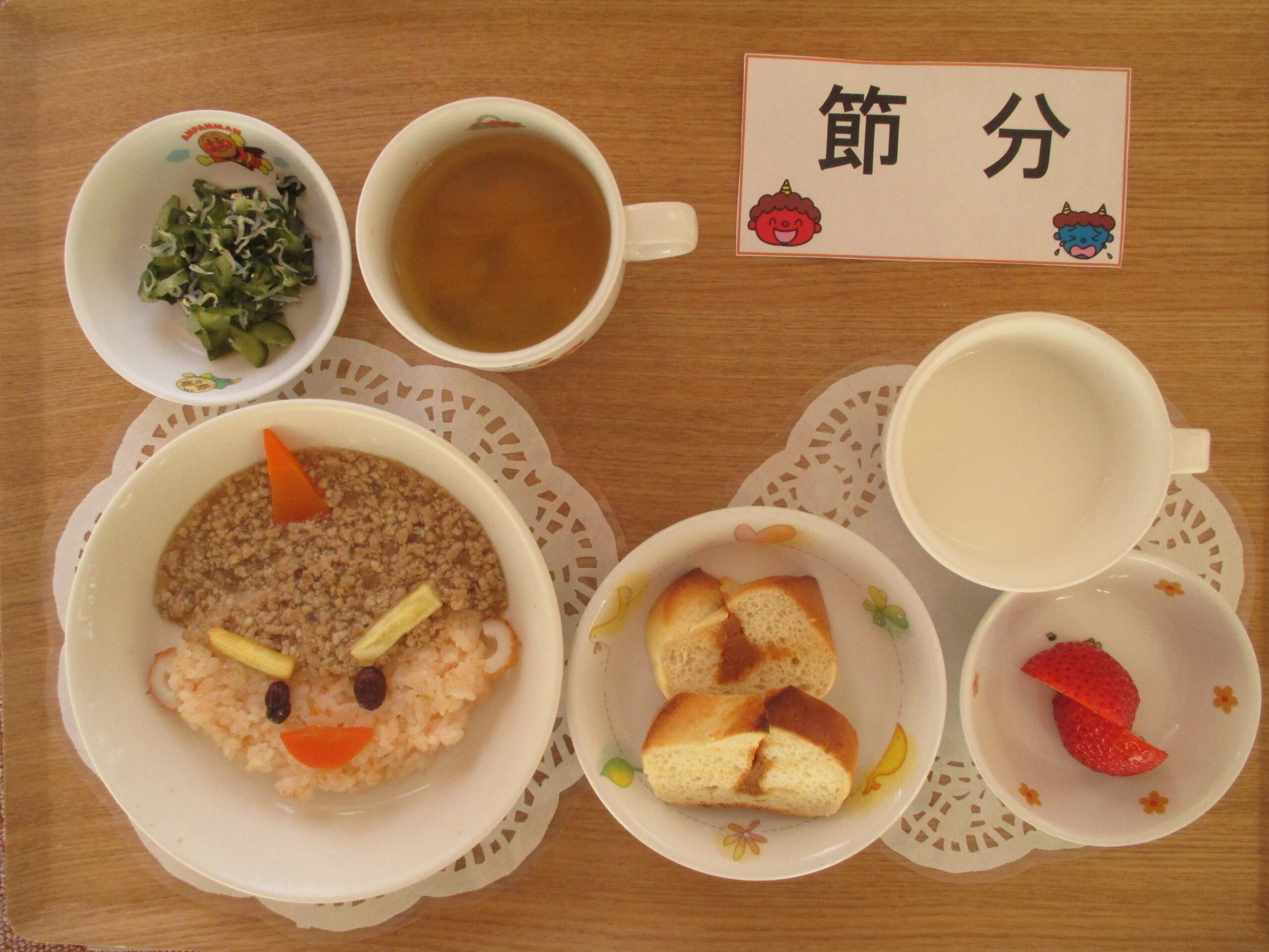 赤鬼ランチ(人参ご飯、そぼろ、きゅうりとちりめんの酢の物・味噌汁)・3時のおやつ:きな粉サンド、いちご、牛乳