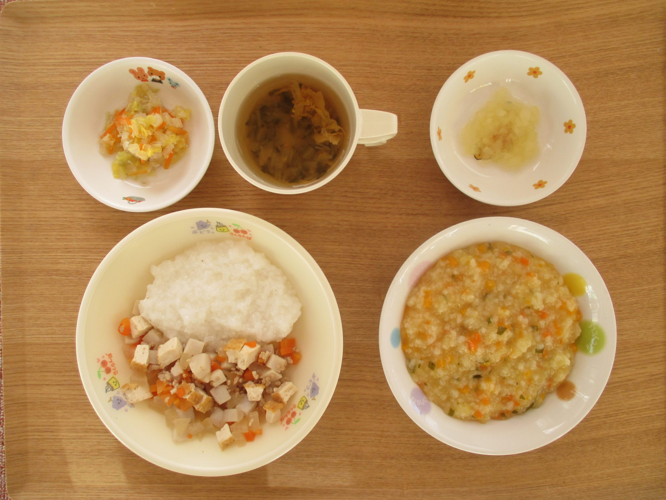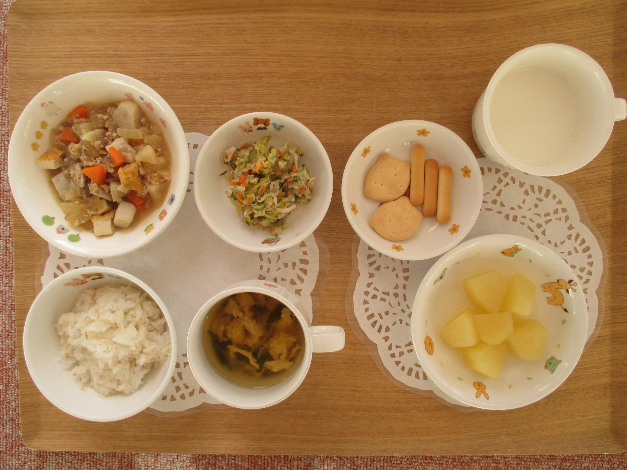 麦ご飯、豚ひき肉と根菜の味噌煮、白菜の柚子酢和え、かき玉汁・3時のおやつ:りんごのコンポート&クッキー、牛乳