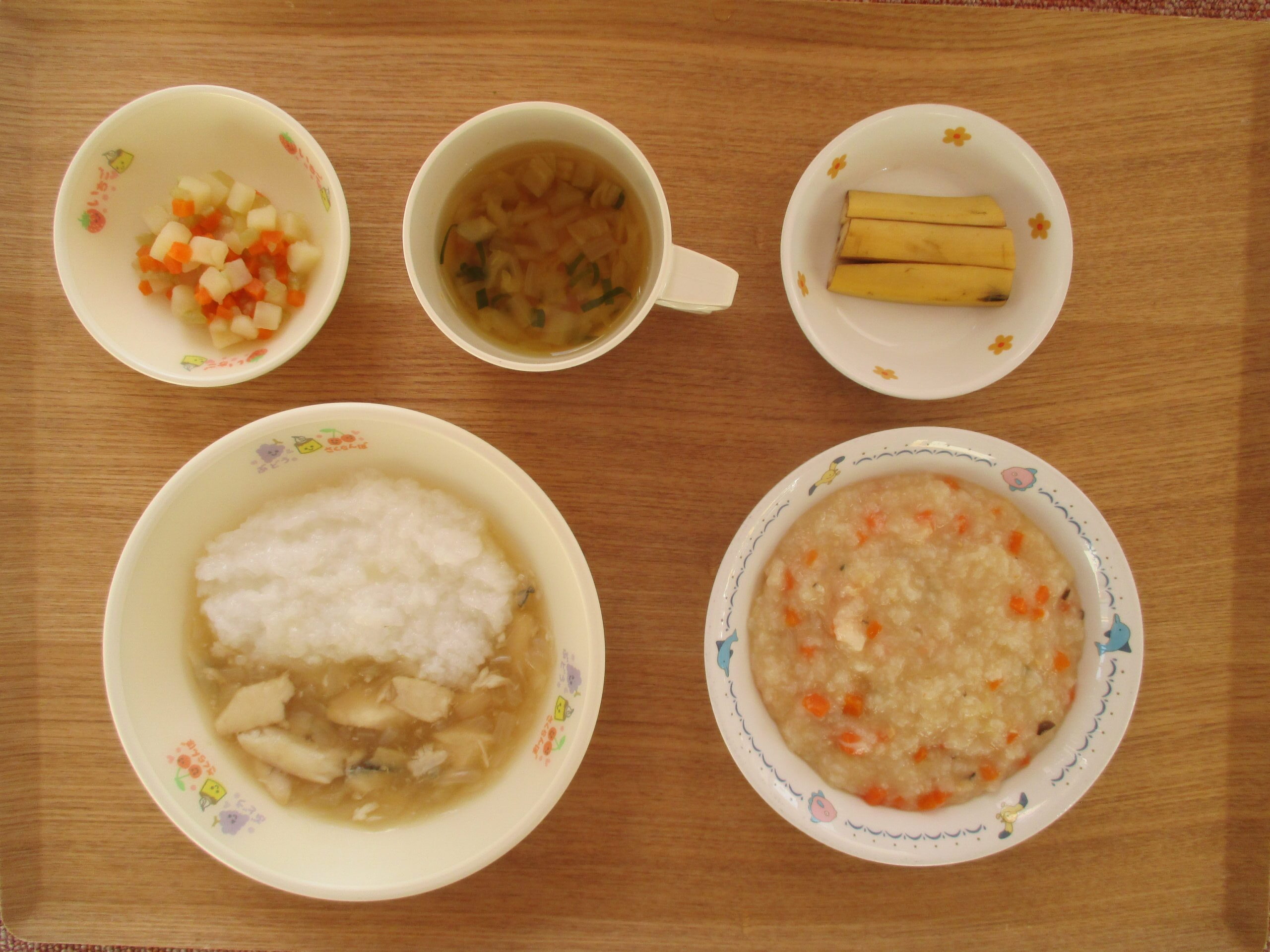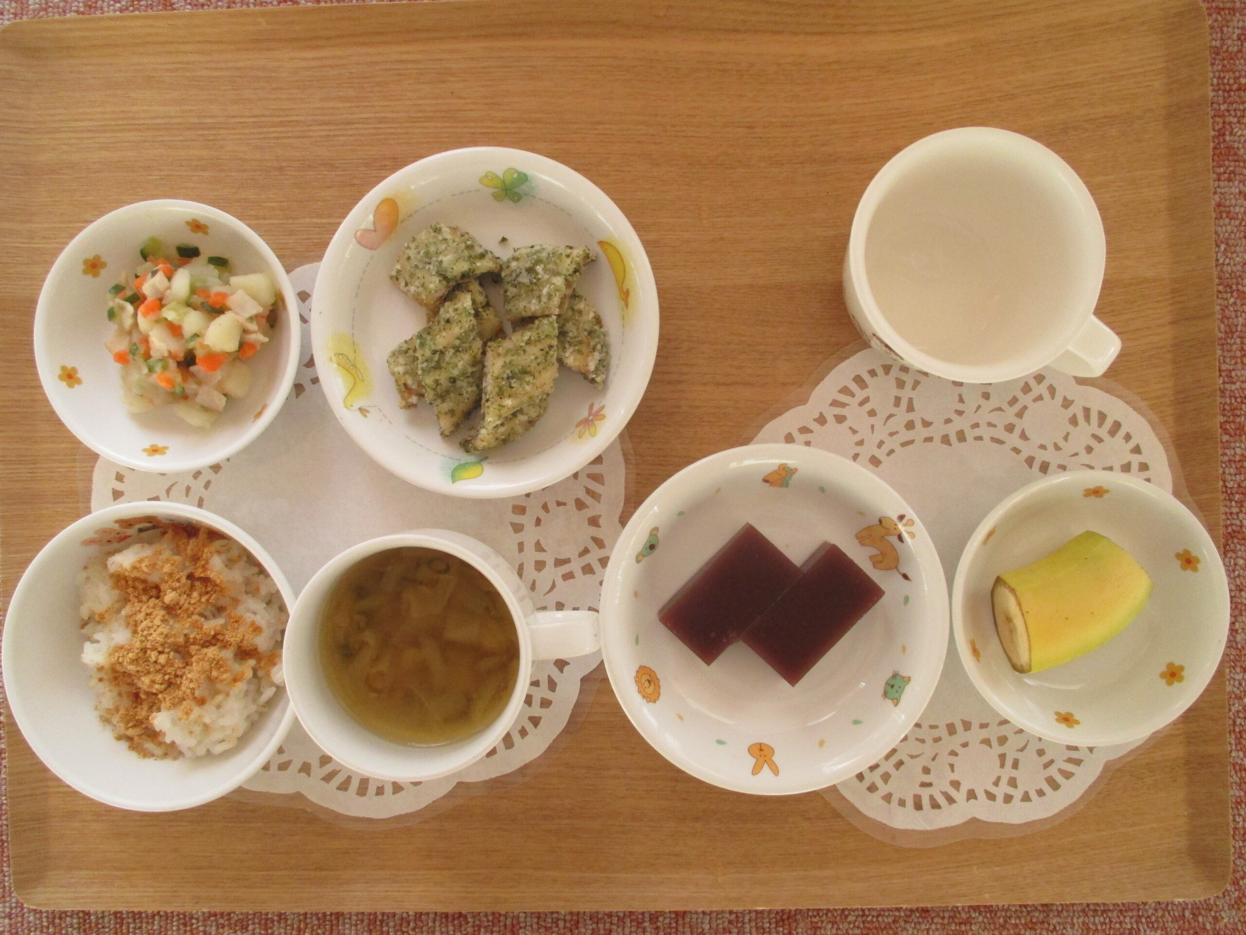 きな粉かけご飯、魚の磯辺揚げ、ポテトサラダ、スープ・3時のおやつ:水ようかん、バナナ、牛乳
