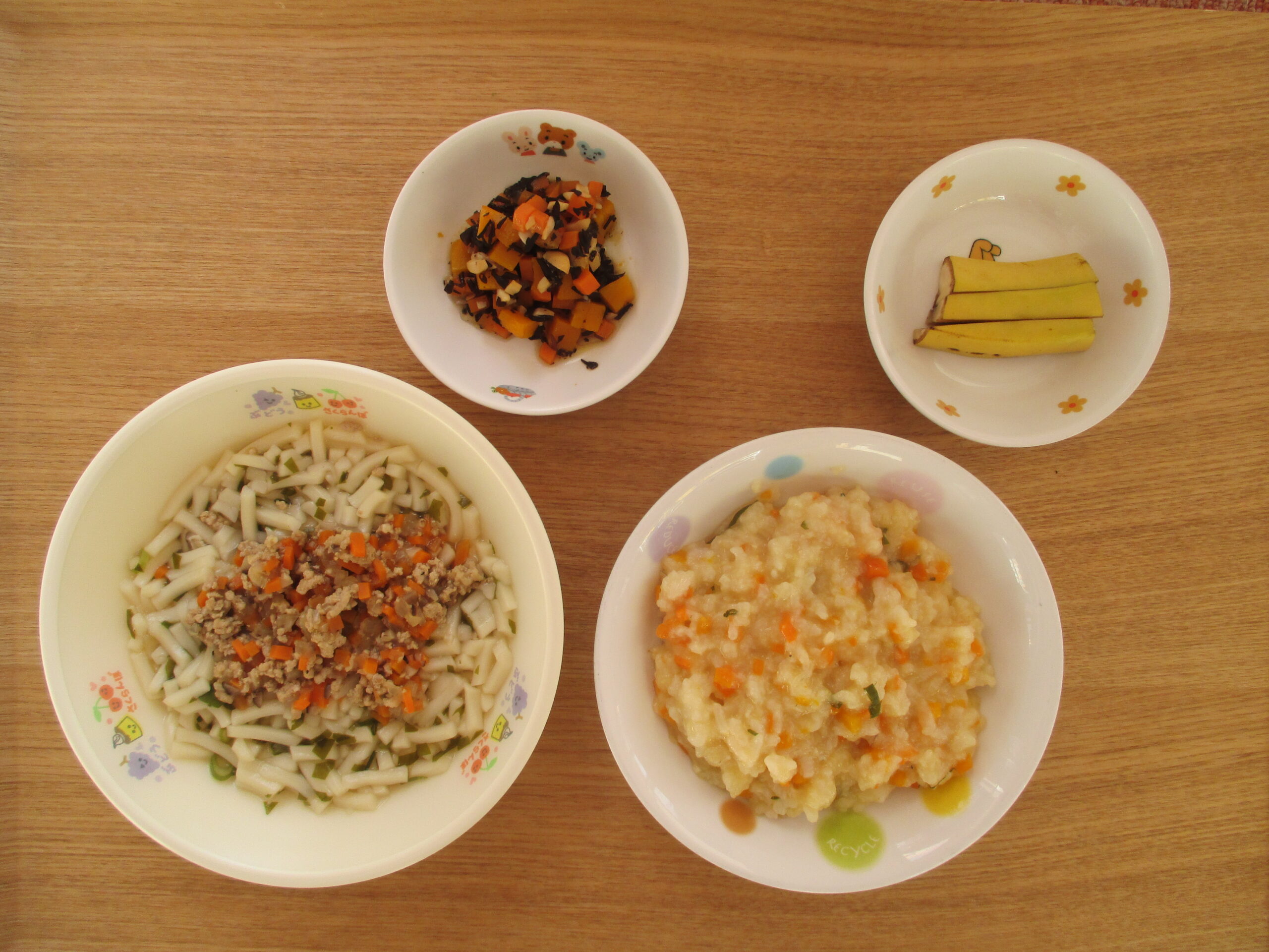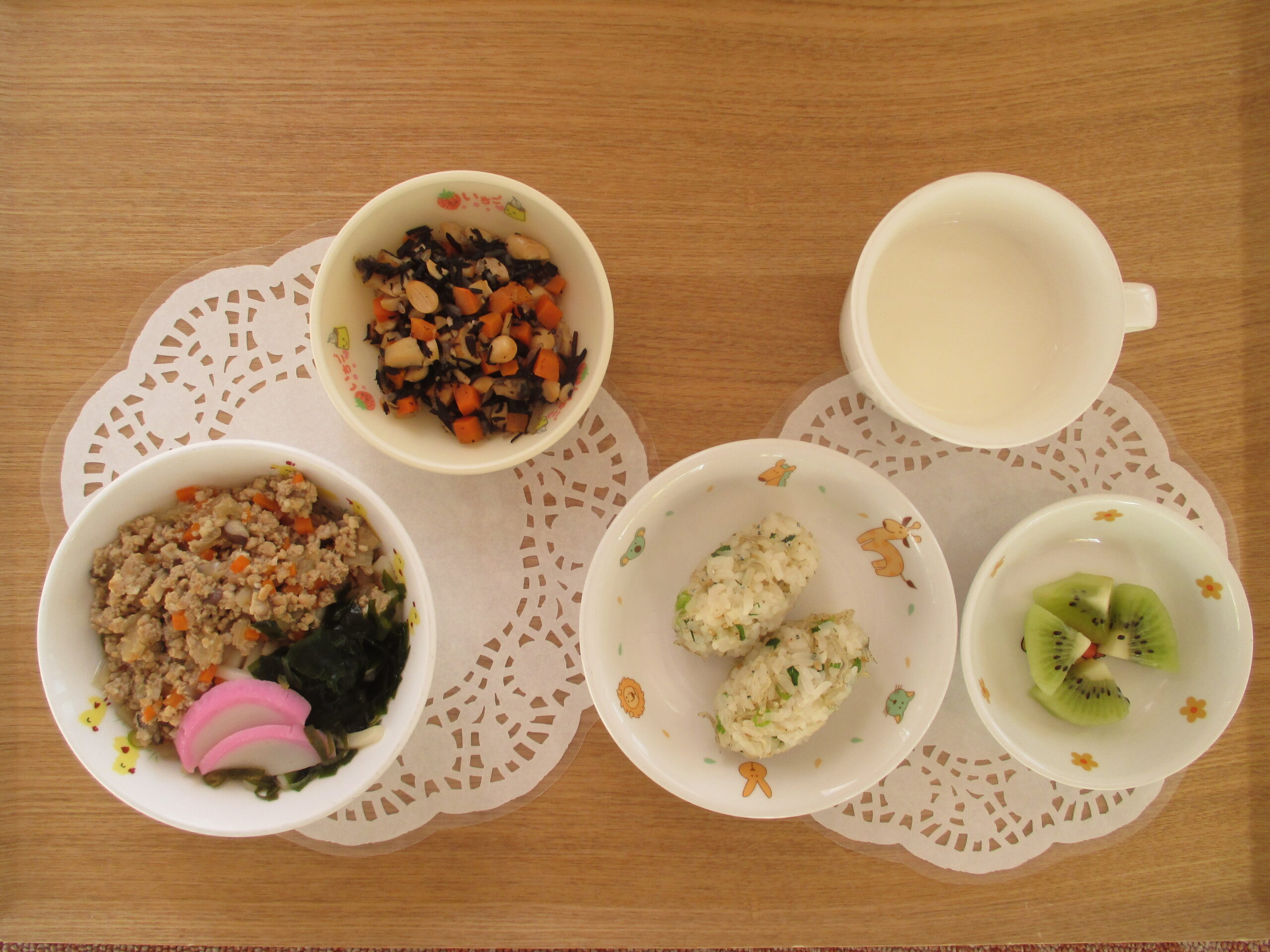 肉わかめうどん、五目煮豆・3時のおやつ:じゃこおにぎり、キウイ、牛乳
